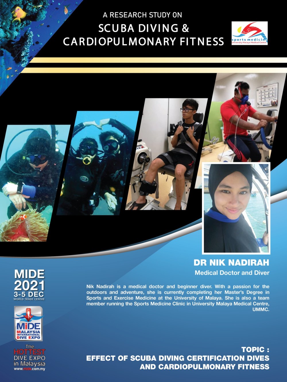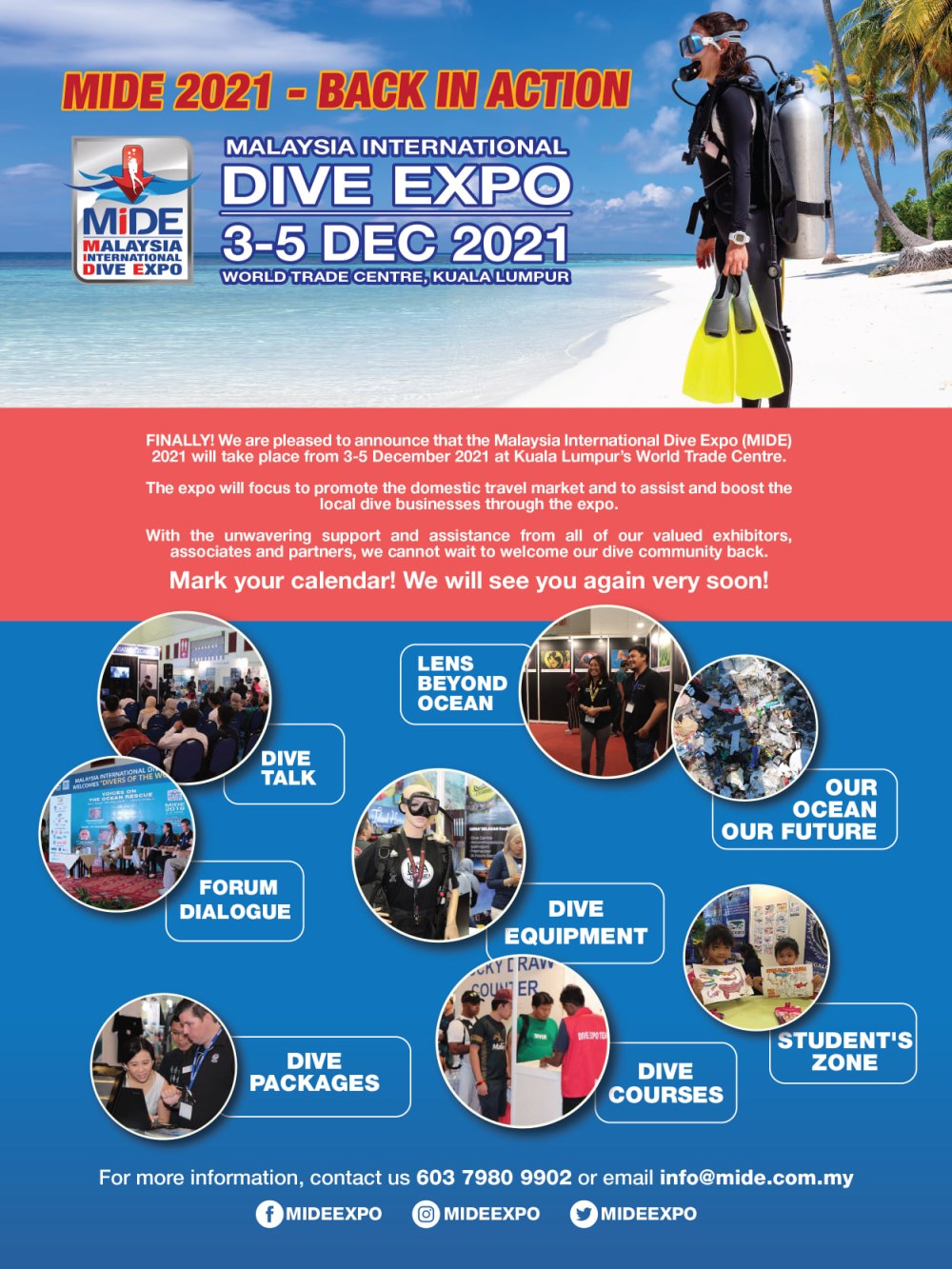 The Malaysian International Dive Expo (MIDE) is the one and only dive expo in Malaysia organized yearly which aims to boost the diving industry. The expo focuses on encouraging visitors to explore the underwater world; to get to know the dive community and industry; to exchange ideas; and share knowledge through the trade of products and services, as well as seminars and forums. The expo also aims to promote a wide range of international and local brands to fellow Malaysians.