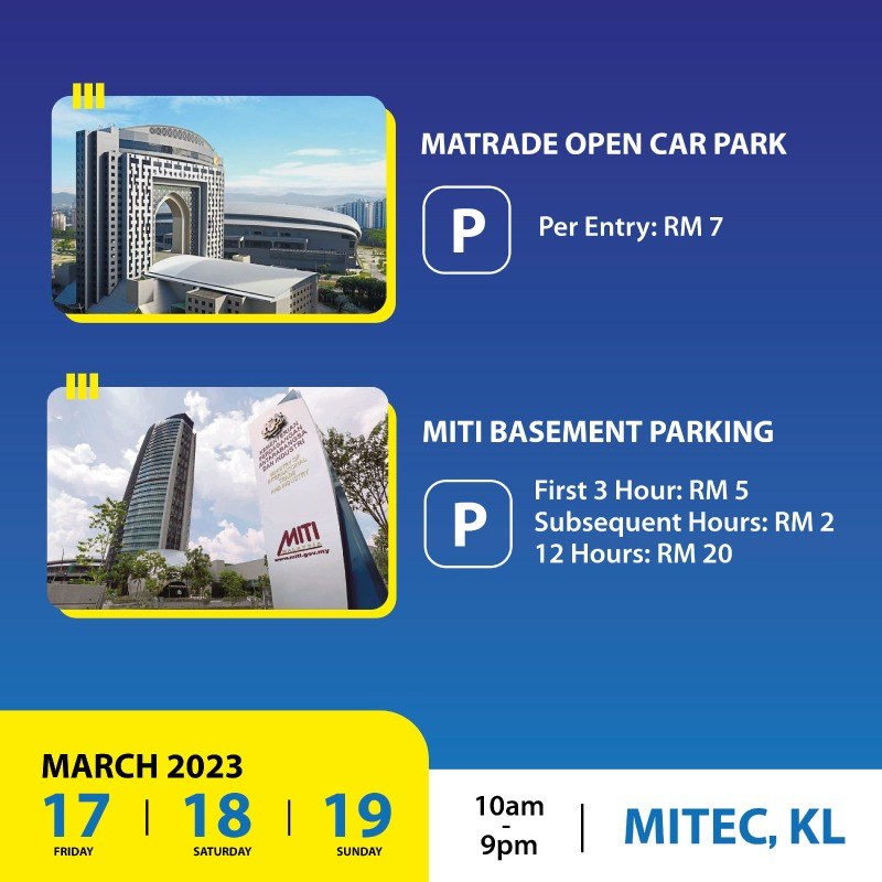 If you are driving, parking is available at: 🅿️ MITEC (South & North Entrance), MATRADE and MITI parking.